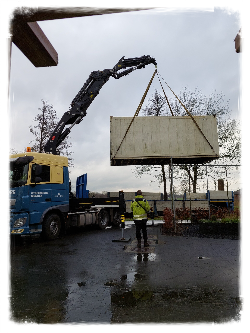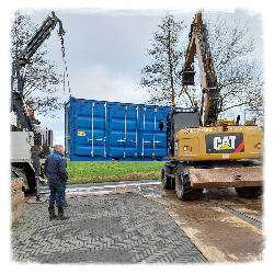 De tweede container ging gelukkig een stuk gemakkelijker, daar er toen meer ruimte op ons erf was, kon de kraan er beter bij en gaf dit geen problemen