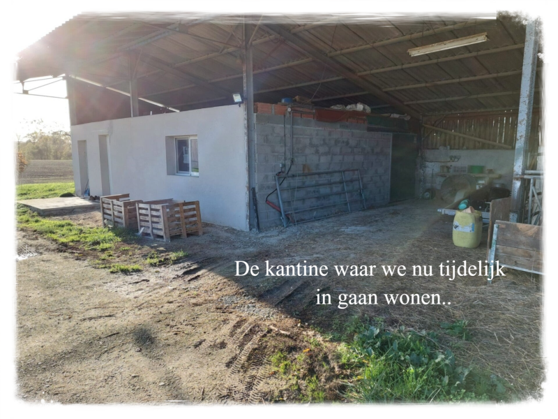 Huis: We krijgen regelmatig de vraag hoe/waar we nu wonen en wanneer we ons huis gaan verbouwen. We wonen nu in de kantine die bij de boerderij staat. Het plan is om deze op termijn uit te gaan bouwen/vergroten. Eerder hebben we gedacht over nieuwbouw bouw op een andere plek op ons erf maar ook hiervoor gelden allerlei regels in Frankrijk. Als we de huidige kantine gaan verbouwen en onder hetzelfde dak blijven als waar we nu onder zitten dan is dat ‘verbouw’ en geen nieuwbouw. Voor nieuwbouw gelden veel strengere regels als voor verbouw namelijk dus we hopen dat we op deze manier eerder een vergunning binnen krijgen als voor nieuwbouw. Maar om een vergunning voor verbouw te krijgen is ook eerst een tekening nodig van een architect en in het gunstigste geval zal ook het aanvragen van vergunningen voor verbouw al minimaal 5 maanden in beslag nemen. Daarna moet ook de aannemer nog tijd hebben dus voorlopig wonen wij nog wel een tijd in de kantine. Het is klein maar met zijn tweeën wel te doen. Wat ik voornamelijk mis is kastruimte en een ‘normale’ keuken, maar met wat improviseren en niet te krap kijken kunnen wij hier wel een tijdje wonen.